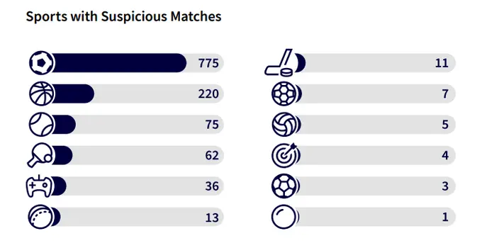 El mayor número de posibles "contrataciones" se encontró en el fútbol, con más de 775 partidos. El baloncesto ocupa el segundo lugar con 220 juegos sospechosos, 3,5 veces más que el año anterior. La mayoría de los partidos extraños se encontraron en Europa: más de 630 (más de la mitad del total).